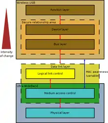 UWB defines both PHY and MAC layers, which need to be integrated in the W-USB model. In particular, MAC is joined with the logical link control (LLC) sublayer to form the link layer, responsible for encryption/decryption, PHY error management and synchronization, while PHY itself covers the correctness of headers, not payloads.