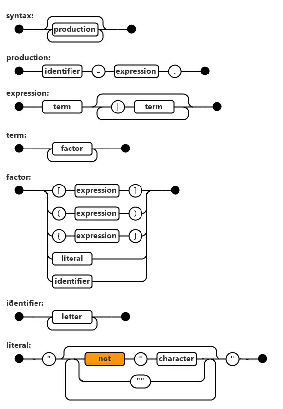 The syntax of BNF can be represented with WSN as follows, based on translating the BNF example of itself: