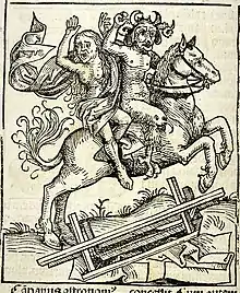 The Witch of Berkeley is a medieval English legend describing a woman from Berkeley, Gloucestershire, who sold her soul to the Devil for wealth. After being alerted to her encroaching demise by an omen from her pet jackdaw, she leaves instructions with her children on how to safeguard her spirit after death. In accordance with her wishes, her body is wrapped in elk hide and then placed inside a stone coffin which is then fastened by three chains. For three nights her family stood watch over her grave, but each night a demon came a broke one of the chains. On the third night, when all the chains had been broken, the Devil appeared and set the Witch on ‘a black horse… with iron hooks projecting over the whole of his back.' She was then carried off into Hell leaving nothing but the sound of 'her pitiable cries'.[2][3]