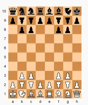 Wolf chess (German: Wolf-Schach) is a chess variant invented by Dr. Arno von Wilpert in 1943.[1][2] It is played on an 8×10 chessboard and employs several fairy pieces including wolf and fox – compound pieces popular in chess variants and known by different names.
