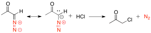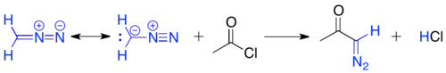The Arndt–Eistert reaction[19] involves the acylation of diazomethane with an acid chloride, to yield a primary α-diazo ketone. The carbon terminus of diazomethane adds to the carbonyl, to create a tetrahedral intermediate, which eliminates chloride. The chloride then deprotonates the intermediate to give the α-diazo ketone product.