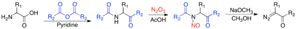 The Dakin–West reaction is a reaction of an amino acid with an acid anhydride in the presence of a base to form keto-amides. The Franzen modification[20] to the Dakin–West reaction[21] is a more effective way to make secondary α-diazo ketones. The Franzen modification nitrosates the keto-amide with N2O3 in acetic acid, and the resulting product reacts with methoxide in methanol to give the secondary α-diazo ketone.