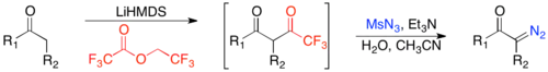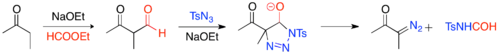 Diazo-transfer reactions are commonly used methods, in which an organic azide, usually tosylazide, and an activated methylene (i.e. a methylene with two withdrawing groups) react in the presence of a base to give an α-diazo-1,3-diketone.[22] The base deprotonates the methylene, yielding an enolate, which reacts with tosylazide and subsequently decomposes in the presence of a weak acid, to give the α-diazo-1,3-diketone.