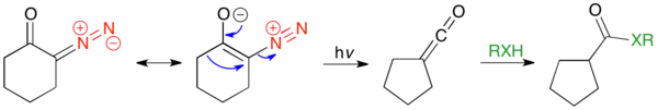 The Wolff rearrangement can be induced via thermolysis,[3] photolysis,[4] or transition metal catalysis.[3] In this last case, the reaction is sensitive to the transition metal; silver (I) oxide or other Ag(I) catalysts work well and are generally used. The Wolff rearrangement has been used in many total syntheses; the most common use is trapping the ketene intermediate with nucleophiles to form carboxylic acid derivatives. The Arndt-Eistert homologation is a specific example of this use, wherein a carboxylic acid may be elongated by a methylene unit. Another common use is in ring-contraction methods; if the α-diazo ketone is cyclic, the Wolff rearrangement results in a ring-contracted product. The Wolff rearrangement works well in generating ring-strained systems, where other reactions may fail.