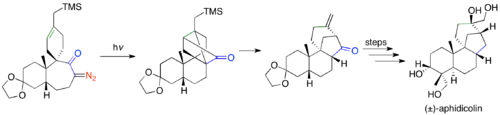 Ketene [2 + 2] cycloaddition reactions have been used in many total syntheses since Corey's use of the [2 + 2] cyclization in synthesizing the prostaglandins.[35] Robert Ireland's synthesis of (±)-aphidicolin uses the Wolff rearrangement to do a tandem ring-contraction, and [2 + 2] cycloaddition.[38]