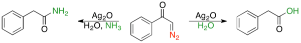 In 1902, Wolff discovered that treating diazoacetophenone with silver (I) oxide and water resulted in formation of phenylacetic acid. Similarly, treatment with silver (I) oxide and ammonia formed phenylacetamide.[3] A few years later, in an independent study, Schröter observed similar results.[5] The reaction is occasionally called the Wolff-Schröter rearrangement.[2] The Wolff rearrangement was not commonly used until 20 years after it was discovered, as facile diazo ketone synthesis was unknown until the 1930s.[2] The reaction has proven useful in synthetic organic chemistry and many reviews have been published.[1][2]