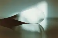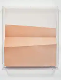 Tillmans further explores the bounds of photography as a medium in his “paper drop” series (2001–8). He started to make ‘paper drop’ images depicting photographic paper specifically exposed to coloured light in his darkroom in 2001.[36] He creates extraordinary sculptural forms in photographic paper; then, by photographing them, returns them to the accustomed flatness of that medium. Photography’s step from ‘picture’ to ‘object’ is best demonstrated in the works from the “Lighter” Series (2005–8),[37] in which the artist dropped the act of photographing and allowed the photographs - in their three-dimensional form – to only represent themselves,[38] recalling his ongoing series "Impossible Color" (1996–present). These colourful photo-paper works are folded, creased or otherwise manipulated, allowing for a subtle play with the material surface and the resulting illusion of lines and contrast. Contained under plexiglas lids, they have a rather sculptural quality.[39]