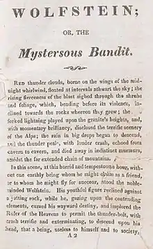 Wolfstein; or, The Mysterious Bandit is an 1822 chapbook based on Percy Bysshe Shelley’s 1811 Gothic horror novel St. Irvyne; or, The Rosicrucian.[1]