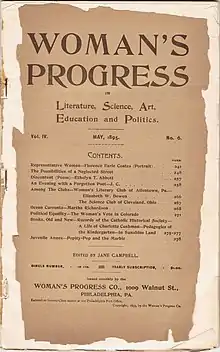 Woman's Progress was founded by Jane and Marianne Campbell in 1892.[1] The journal ran until 1896.[1] The Campbell sisters wrote under the pseudonyms, "T.S. Arthur" and "Catherine Osborne".[2] The first editions came out in 1893 and included contributions from Mary Grew, Elizabeth Powell Bond, and more.[3] Grew was featured in the "Representative Women" columns that the periodical featured.[4] As Catholics, the Campbells often focused on Catholic women in the periodical, though the sister also featured non-Catholics working to achieve women's rights and other similar goals.[4] The paper also supported women's suffrage.[5] It tackled issues that were considered both progressive at the time and also gave time to conservative issues.[6]