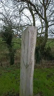 The spelling "Wombourne" is now preferred for official use. However, the village is marked "Wombourn" on the 1775 William Yates Map of the County of Stafford and as late as the 1945–48 series Ordnance Survey maps.[4] There has been considerable feeling about the issue and road signs were regularly amended unofficially with spray paint until the 1990s at least.