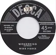 "Wondering" is a 1930s song written by Joe Werner and originally recorded by the Riverside Ramblers. It is best known for the version recorded by Webb Pierce in 1951. It was Pierce's first number one on the Billboard country and western charts, topping the Country & Western Records Most Played By Folk Disk Jockeys chart for four weeks.[1]