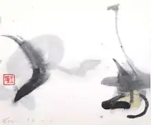 In his ink paintings, Wong sought out a midway between two traditions, much as commentators have often recognised in the newspapers.[31][32] Bringing the gesturalism of action painting and modernist compositional sensibilities into the realm of calligraphic strokes, Wong's early New York ink paintings thus reflected "an urgent need to re-evaluate 'the sublime nature of abstraction that long defined the Chinese ink culture.'"[44] Roy Moyer commented that "when he arrived in New York in 1961 to study at the Art Students League, he was quite comfortable with abstract expressionist art, since there is nothing more abstract than those Chinese calligraphic ideograms which he knew so well."[42]