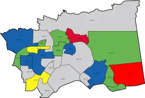 The pro-democrats scored a historic landslide victory in the 2019 election amid the massive pro-democracy protests by taking all the seats in the council. The pro-Beijing councillors were completely wiped out as a result, with Democratic Party becoming the largest party.