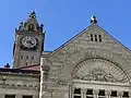 The clock tower rises to a height of 195 feet (59 m). At the time of its construction, the clock hands were the second largest in America spanning 16 feet (4.9 m) in diameter. They were only exceeded by the hands on the clock of the Chronicle newspaper building in San Francisco which were 16.5 feet (5.0 m) in diameter. The clock was made by the E. Howard & Co. at a cost of $3000. The clock tower bells weigh 2,000 lb (910 kg).