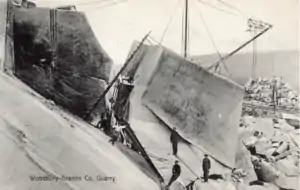 The company grew rapidly: it employed 132 people in 1900, which became 500 in 1905, and 800 in 1911. By 1914, WGC had a total of 1,400 employees in multiple quarries in Woodbury and Bethel and cutting and finishing plants in Hardwick, Bethel and Northfield. As of 1911, it had four million dollars of unfinished work on its books and had begun subcontracting work to other granite companies in Hardwick as well as to companies as far away as Concord, New Hampshire, and Westerly, Rhode Island.[6] In 1912, the company signed 117 new building contracts—one every three days—including for 32 office buildings, 19 mausoleums, 14 banks and post offices, and five railroad stations, as well as hotels, courthouses, and private residences.[7]: 233–34 The same year, it opened its White quarry in Woodbury, allowing it to sell a wider range of stone. "Hardwick White" became another of its brands.[23]