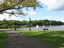The boomerang-shaped section north of the park is bordered by the southeastern Bergen County towns of Cliffside Park and Fairview,[2] is characterized by a garden apartment complex called Woodcliff Gardens.[3] The neighborhood south of the park is bordered by Boulevard East and Bergenline Avenue, across from which is North Bergen Public Library[4] and the Racetrack Section. It southern border is shared with the borough of Guttenberg. High density housing includes single and multi-family dwellings as well as low-rise and high-rise apartment buildings.