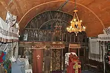 Toader the Painter worked on the interior in 1760; his art survives in the altar and iconostasis. The oldest icon, by another artist and depicting Saint Nicholas, dates to 1744, indicating a likely construction date. A porch icon of the patron saint is also by Toader. The iconostasis front icons are from 1857. A number of saints are depicted in the altar, as well as the Binding of Isaac, a common altar subject. Several prophets are painted in medallions on the reverse of the iconostasis, above the doors. Saints Stephen, Lawrence and Romanus of Caesarea appear between the doors. Toader’s signature is near the north door. The Virgin Mary is shown on the altar ceiling, as well as Saint Anthony the Great. The bishops are depicted wearing peasant costume.[7]