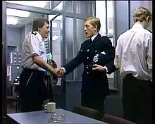 "Woodentop" has an unusual place in the history of The Bill due to the original premise of this being a one-off play. After broadcast, Thames commissioned a full series to be shown the following year, under the name The Bill as the show had the potential to appeal to a mass audience. Although The Bill is clearly a continuation from this episode, the main series contradicts it in a number of ways. For instance, in Woodentop Litten has completed his secondment to CID[4] and is close to securing his place in the detective branch, whereas in The Bill he does not gain his CID secondment until halfway through Series One. In addition many central characters in "Woodentop" - such as Sergeant Wilding and Inspector Deeping - vanish between the pilot and the series. Deeping does gain one mention in Series One, in the episode "It's Not Such a Bad Job After All", where Ackland is informed that he is coming to meet her on the scene of a suicide - a later radio transmission, however, reports that Sgt. Bob Cryer is to meet her instead. Although Wilding is not mentioned following Woodentop, he shares several characteristics with Sgt. Cryer - including a position as the "father figure" of the Sun Hill relief, and an apparently tumultuous relationship with Roy Galloway, whom both Cryer and Wilding refer to as a "bloody superstar". In the first episode of Series One, "Funny Ol' Business - Cops and Robbers", Galloway and Cryer make apparent reference to the events of Woodentop in regards to Jim Carver. Galloway suggests that it is Cryer who requested the favour, further suggesting that Cryer and Wilding are in fact the one character, and that, like PC Taffy Morgan (later Taffy Edwards), Jack Wilding's name has merely been changed to Bob Cryer. There are also discrepancies with the naming of some of the characters. In the 2003 live episode of The Bill, made to celebrate the twentieth anniversary of broadcast, Carver and Ackland discuss events from the pilot, whereupon Carver incorrectly refers to the character of Taffy by the surname Morgan, a name that was dropped for the series proper in favour of "Edwards".[5] There are also mistakes made in some of the uniforms the cast wore during the episode, for example, in one scene, PC Dave Litten is on foot patrol with PC Jim Carver, and PC Litten's helmet has GR on the helmet badge where it should have had ER, the same that was on PC Carver's helmet. Also the tunics the male officers wore had buttoned down epaulettes, whereas they should have just had the insignia placed on the shoulder of the tunic as this is what the Metropolitan Police wore at the time. Only four of the cast of "Woodentop" would go on to be regulars in the main series of The Bill: Mark Wingett, Trudie Goodwin, Gary Olsen and Colin Blumenau, while a number of characters were re-cast, including Roy Galloway.[6]