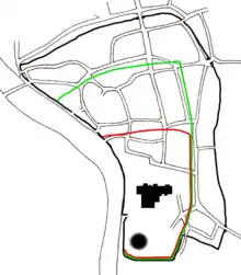 The first defensive walls at Worcester were built after the Roman conquest of Britain in AD 43. Although a settlement existed on the site during the Iron Age, there is no evidence that walls were ever built around it.[1] The Roman town was probably preceded by the construction of a Roman fort, both located on the south side of the modern city and protected by the River Severn to the west.[2] There are relatively few historical details or archaeological evidence from this period, but archaeological investigations of the Roman town walls suggest that it had wooden ramparts and was protected by an 89-foot (27 m) wide ditch. As with other Roman towns, the walls would have enclosed a rectangular town, protecting a settlement with a grid-like network of streets.[3]