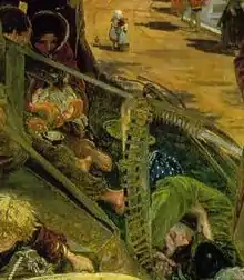 Brown explained that he had intended to demonstrate that the modern British workman could be as fit a subject for art as the more supposedly picturesque Italian lazarone (literally, the "mob," used to refer to the street people of Naples).[5] He set the painting on Heath Street in Hampstead, of which he made a detailed study. Hampstead was at the time a wealthy area on the outskirts of London, which was undergoing rapid expansion. The development of the new sewerage and drainage systems in the city was also widely discussed in the press as an agent of modernisation. The character of "Bobus" appears in the writings of Thomas Carlyle as the epitome of a corrupt businessman who uses his money to market himself as a politician.