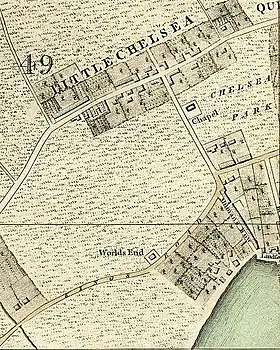 In the King's Road, near Milman Street, is an inn styled "The World's End." The old tavern... was a noted house of entertainment in the reign of Charles II. The tea-gardens and grounds were extensive, and elegantly fitted up for the reception of company. The house was probably called "The World's End" on account of its then considerable distance from London, and the bad and dangerous state of the roads and pathways leading to it. (Old and New London, 1878)[1]
