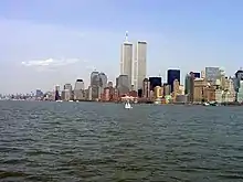 ![]() The original complex in March 2001. The tower on the left, with antenna spire, was 1 WTC. The tower on the right was 2 WTC. All seven buildings of the WTC complex are partially visible. The red granite-clad building left of the Twin Towers was the original 7 World Trade Center. In the background is the East River. | |||||||||||||||||||