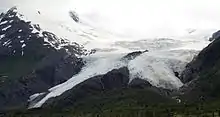 The Worthington Glacier is a 5,774-acre (2,337 ha) valley glacier located adjacent to Thompson Pass in the southeastern mainland section of the U.S. state of Alaska. Located on the Richardson Highway at milepost 28.7 mi (46 km) east of Valdez, it was listed as a National Natural Landmark in 1968. The Worthington Glacier State Recreation Site, a 113-acre (0.46 km2) roadside park operated by the state of Alaska, offers a view of the glacier, and it is acclaimed as one of the remaining U.S. glaciers that is accessible by paved highway.[1] Like most of Alaska's glaciers, this glacier has been steadily retreating for the last 150 years, but not as dramatically as many others.