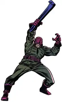 Dirk Garthwaite, a.k.a. the Wrecker, first appeared in Thor, and is depicted as a former manual laborer for a demolitions crew who is fired for his violent and anti-social tendencies. Garthwaite created a costume for himself and called himself the Wrecker, committing a series of robberies, demolishing looted locations and leaving a crowbar at the scene of the crime.[3] The Wrecker entered a hotel room occupied by Asgardian god Loki, the adopted brother and archenemy of the Thunder God Thor. Upon knocking out the de-powered Loki, the Wrecker put on his helmet and received an enchantment from Loki's ally, Karnilla the Norn Queen, who assumed he was Loki because the Wrecker was wearing his helmet and she only saw him from the back. Therefore, Karniila was the source of his newfound enchanted powers. Reveling in his power, the Wrecker embarked on a crime spree and defeated Thor who, at the time, had had his power severely reduced by his father Odin (ruler of the Norse gods) as punishment for choosing to remain on Earth. A building collapsed onto the Thunder God, nearly killing him. The Wrecker was defeated by the Asgardian goddess Sif, who animated the armor of the Asgardian Destroyer to save Thor. The Wrecker's crowbar was shattered.[4]