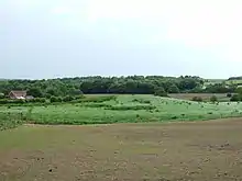 Boar's Den,[3] thought to be a Bronze Age round barrow, is relatively undisturbed and consists of an earth and stone mound 73 yards (66.5m) (E/W) by 68 yards (62m) (N/S) with a maximum height of 8 feet (2.5m) that suffered some plough damage in the past and is now used only as grazing land. If this round barrow were not marked on a map, despite being fairly extensive, it might be missed on the ground, mistaken as a natural lump in the middle of the field.[4]