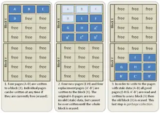 - Data is written to the flash memory in units called pages, which are made up of multiple cells. However, the memory can be erased only in larger units called blocks, which are made up of multiple pages.[2]