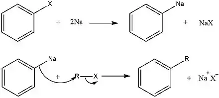 There are two approaches to describing the mechanism of the Wurtz–Fittig reaction.[10][11] The first involves the sodium-mediated formation of both alkyl and aryl radicals. The alkyl and aryl radicals then combine to form a substituted aromatic compound.