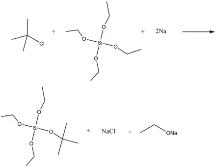 The Wurtz–Fittig reaction has limited applicability, since side reactions such as rearrangements and eliminations are prevalent.[14] However, the reaction is useful for the laboratory synthesis of organosilicon compounds, although there are challenges in adapting the procedure to a large-scale industrial process.[17] Organosilicon compounds successfully synthesized using the Wurtz–Fittig reaction include silylated calixarenes,[18] t-butylsilicon compounds,[19] and vinylsilanes.[20] For example, t-butyltriethoxysilane can be prepared with the Wurtz–Fitting reaction by combining tetraoxysilane, t-butyl chloride and molten sodium. The reaction proceeds with a 40% yield.[19]