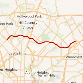 | 0.00 | 0.00 | Lockhill-Selma Road | Western terminus; road continues southwest as Wurzbach Road | ||