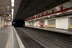 Wurzerstraße is one of the four underground stations on the Bad Godesberg branch served by both Cologne and Bonn Stadtbahn. This station is served by line 16, 63 and 67. Because the Bad Godesberg underground stations have 4-main color tiles, the Wurzerstraße have red tiles.