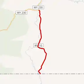 WYO 10 is a north–south route that runs from Wyoming Highway 230 in Woods Landing south to the Wyoming-Colorado State Line and continues into Colorado as Larimer County Route 103. WYO 230 serves the Jelm Mountain Observatory (at an elevation 9656 feet). Mileposts along WYO 10 increase from north to south (0.00 to 9.12).[2] Wyoming Highway 10 is the lowest numbered state route in Wyoming.[1][3]