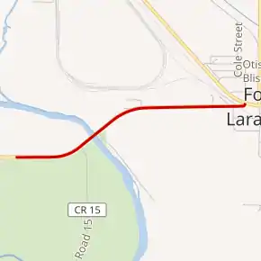 Wyoming Highway 160 is a short route at only 1.08 miles (1.74 km) in length that provides access to the Fort Laramie National Historic Site and areas west and southwest of Fort Laramie. Highway 160 begins at Goshen CR 53[2] and travels east, passing north of the Fort Laramie Historic Site. WYO 160 crosses the North Platte River before reaching Fort Laramie where the highway ends at US Route 26 (Merriam Street).[1][2]