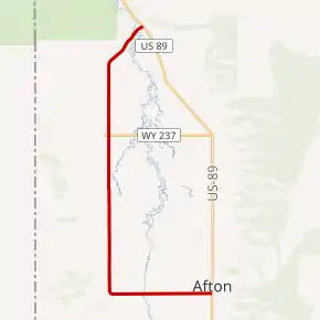 Wyoming Highway 238 begins its southern end at U.S. Route 89 (Washington Street) in Afton. WYO 238 travels west, passing north of the Afton Municipal Airport, as this stretch of WYO 238 runs east-west.[2] After leaving Afton WYO 238 turns north, at approximately 3.2 miles. Now due north, Highway 238 reaches Wyoming Highway 237 in Auburn at just over 8 miles. Highway 237 provides access between US 89 and Auburn.[3] WYO 238 continues northward before gently turning northeasterly and intersecting US 89 at its northern terminus south of Bedford.[2]