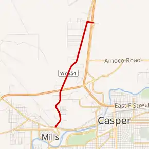 Wyoming Highway 254 begins its south end the Town of Mills, just outside Casper at US 20 Business/US 26 Business (Yellowstone Highway). The Highway continues north into the Town of Bar Nunn at 0.79 miles (located northwest of Casper).[2] Highway 254 intersects US 20/US 26 (Casper Bypass) at 1.40 miles (2.25 km). WYO 254 continues north until 3.9 miles (6.3 km) where it turns east onto Wardwell Road for a short distance and there meets I-25/US 87 (exit 191) where WYO 254 ends.[2][3]