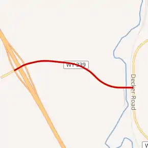 Wyoming Highway 339 begins its western end at Interstate 90/US 14/US 87 (exit 16) and travels east just over 1 mile to end at Wyoming Highway 338 (Decker Road).[2][3] WYO 338 travels south to serve Sheridan as well as north to the Montana State Line and Decker, Montana.