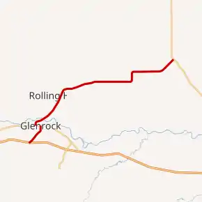 Wyoming Highway 95 begins its western (or southwestern) end at exit 165 of Interstate 25 and the northern end of Converse County Route 19.[2] WYO 95 travels from there northeasterly concurrent with I-25 BUS toward the town center of Glenrock as Deer Creek Road. WYO 95 passes the Glenrock Golf Course [3] as it turns north and assumes the name S. 4th Street as it enters the town center.[2] WYO 95 intersects US 20/US 26/U.S. Route 87 in Wyoming (W. Birch Street) at 2.13-mile (3.4 km). I-25 Business heads south, following 20/26 east and 87 south. Wyoming 95 ends, not running concurrent with the US highways. WYO 95 resumes less than a mile west, just west of the Glenrock city limits.[4] WYO 95 turns northeast and curves around the northern side of Glenrock, crossing the North Platte River, and continuing northeast as Monkey Mountain Road. The town of Rolling Hills is reached north-northeast of Glenrock.[5] WYO 95 continues on its east-northeast track, named Glenrock-Ross Road east of Rolling Hills. WYO 95 turns north and back east again briefly near Carey before reaching its eastern terminus at Wyoming Highway 93 east of Carey.[5][6]