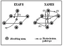 In the NEXAFS region, starting about 5 eV beyond the absorption threshold, because of the low kinetic energy range (5-150 eV) the photoelectron backscattering amplitude by neighbor atoms is very large so that multiple scattering events become dominant in the NEXAFS spectra.