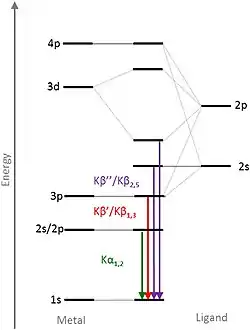 By high-resolution scans of these lines the exact energy level and structural configuration of a chemical compound can be determined. This is because there are only two major electron transfer mechanisms, if we ignore every transfer not affecting valence electrons. If we include the fact that chemical compounds of 3d-transition metals can either be high-spin or low-spin we get 2 mechanisms for each spin configuration.[1]