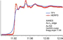 In synchrotron facilities those measurement can be done at the same time, yet the experiment setup is quite complex and needs exact and fine tuned crystal monochromators to diffract the tangential beam coming from the electron storage ring. Method is called HERFD, which stands for High Energy Resolution Fluorescence Detection. The collection method is unique in that, after a collection of all wavelengths coming from "the source" called , the beam is then shone onto the sampleholder with a detector behind it for the XANES part of the measurement. The sample itself starts to emit X-rays and after those photons have been monochromatized they are collected, too. Most setups use at least three crystal monochromators or more. The is used in absorption measurements as a part of the Beer-Lambert Law in the equation