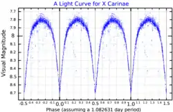 X Carinae is a Beta Lyrae variable in the constellation Carina. It ranges between magnitudes 7.9 and 8.65 over a period of approximately 1.08 days.[3]