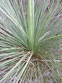 This plant usually has no trunk, or a small trunk about 60 cm (24 in) high, under the skirt of leaves. It may grow to 2.5 metres (8 ft) tall. Similar in appearance to Xanthorrhoea media. The leaves are only 3 to 4 mm wide and glaucous. Flowering occurs between August and October. The flowering spike is shorter than the scape, and is particularly furry, due to the felty bracts.