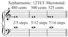 John Chalmers, author of Divisions of the Tetrachord, wrote, "The converse of this definition is that music which can be performed in 12-tone equal temperament without significant loss of its identity is not truly microtonal."[2] Thus xenharmonic music may be distinguished from twelve-tone equal temperament, as well as use of intonation and equal temperaments, by the use of unfamiliar intervals, harmonies, and timbres..