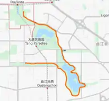 The Xi'an Qujiang Sightseeing Monorail (Chinese: 西安曲江观光轻轨; pinyin: Xī'ān Qǔjiāng Guānguāng Qīngguǐ) is a monorail line in Qujiang New District of Xi'an. The line is a broken loop on the edge of the Nanhu (南湖) public park. [2]
