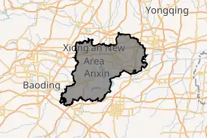 Xiong'an New Area[4] (simplified Chinese: 雄安新区; traditional Chinese: 雄安新區; pinyin: Xióng'ān Xīnqū) is a state-level new area in the Baoding area of Hebei, China.[5] Established in April 2017, the area is located about 100 km southwest of Beijing and 50 km east of downtown Baoding. Its main function is to serve as a development hub for the Beijing-Tianjin-Hebei (Jingjinji) economic triangle. Additionally, "non-core" functions of the Chinese capital are expected to migrate here, including offices of some state-owned enterprises, government agencies, and research and development facilities.