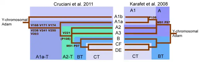 The revised root of the y-chromosome family tree by Cruciani et al. 2011 compared with the family tree from Karafet et al. 2008. It is now known that there is a haplogroup (A00) outside of this scheme. The group designated A1b here is now called A0,[1] and "A1b" is now used for what is here called A2-T.