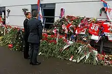City officials in Yaroslavl announced a three-day period of mourning from Friday 9 September 2011 to Sunday 11 September 2011.[25] On 10 September, memorial services for the players were held in their mother countries. The biggest services were held in Arena 2000, the home arena of Lokomotiv Yaroslavl, with thousands of mourners as well as Russian Prime Minister Vladimir Putin in attendance. Local police determined the crowd number at Lokomotiv's home arena to be roughly 100,000.[51][52]